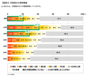 まず、対話型AIを使用する頻度は世代別に下のようになっています。